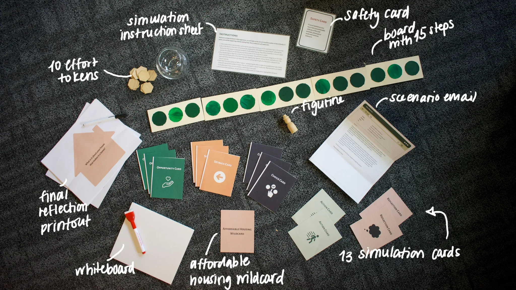 Game mechanics: We developed a board-and-card-based experience, with steps, “effort tokens,” and scenario cards representing opportunities, setbacks, and difficult choices.
